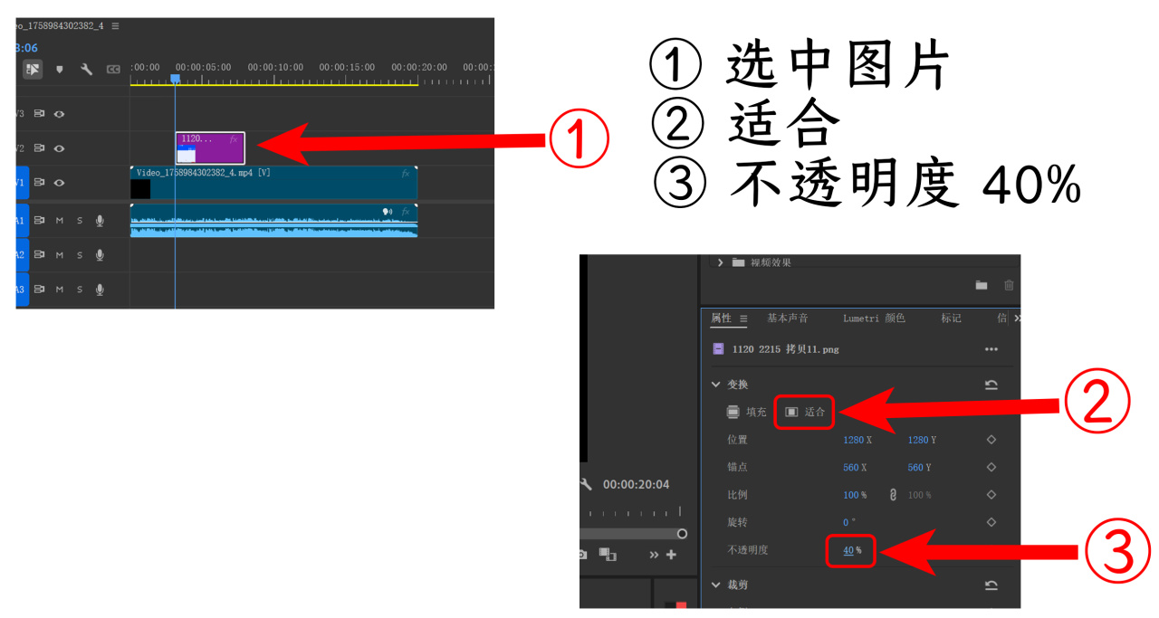 接着点击左上角“文件”-“导入”,选择上面的原理图,在左下角媒体库中选择图片并拖到右边时间轴中,放在视频轨道上方,并且选中图片,右侧“属性”中点击“适合”并将图片“不透明度”调为“40%”左右