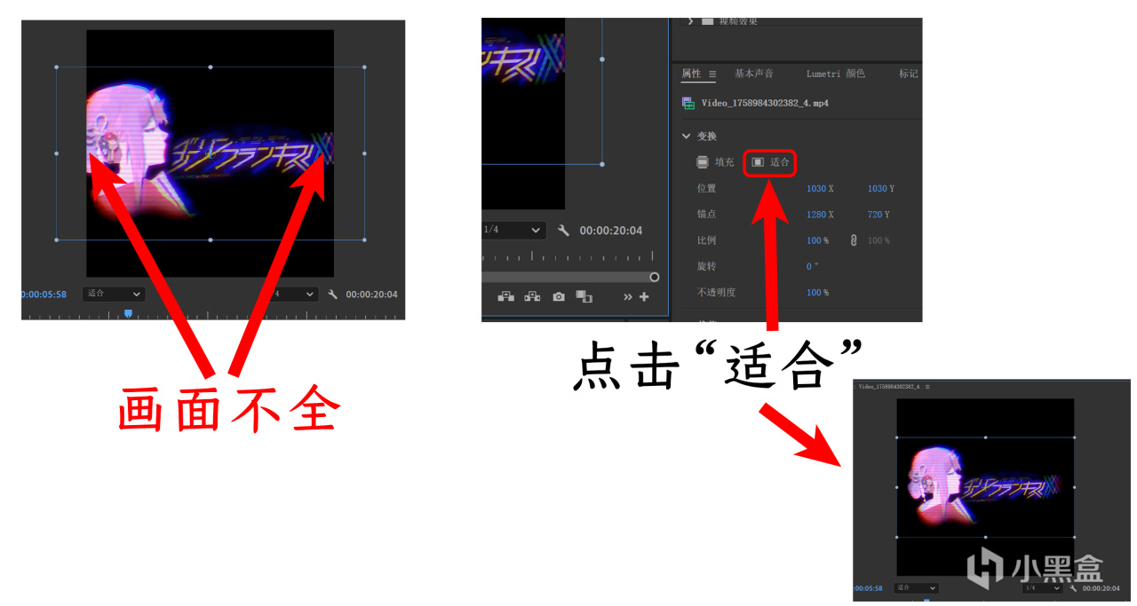 如果确定后视频显示不全,选中视频,在右边属性中点击“适合”,就可以让视频缩放到合适比例