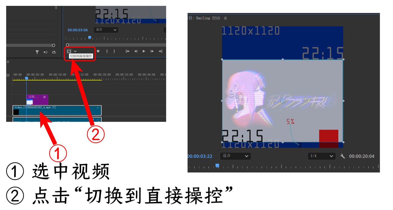 点击下面时间轴中的视频,然后点击“切换到直接操控”,按住Shift键拖动视频,可使其仅沿水平或垂直方向移动,调整素材使素材与白框对齐,可以用方向键微调,调整完毕后就可以在下面序列里选中图片 右键-“清楚”,或者按DEL键将图片去除,接着左上角导出(和二.6一样)就可以得到成品。