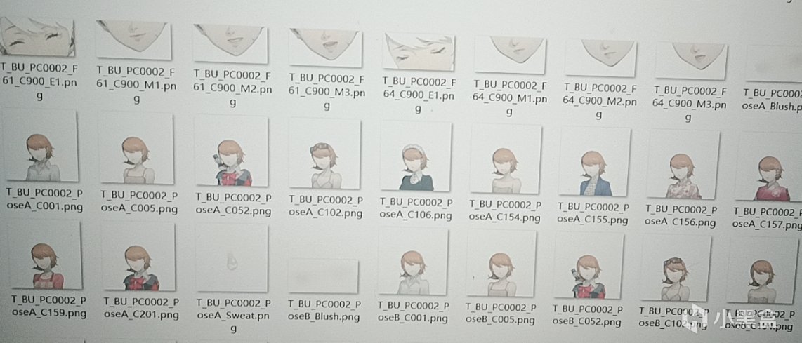 如果還是沒能理解,這有個更簡單粗暴的sega素材解包圖,通過圖片就可以明顯的看到油咖喱的服裝、甚至是臉部表情都是分割成其他各種素材,而在什麼時候塞上什麼表情,什麼時候放上什麼服裝,這種也是程序員的工作(像是上課時出現女僕立繪那八成就是代碼錯亂了)