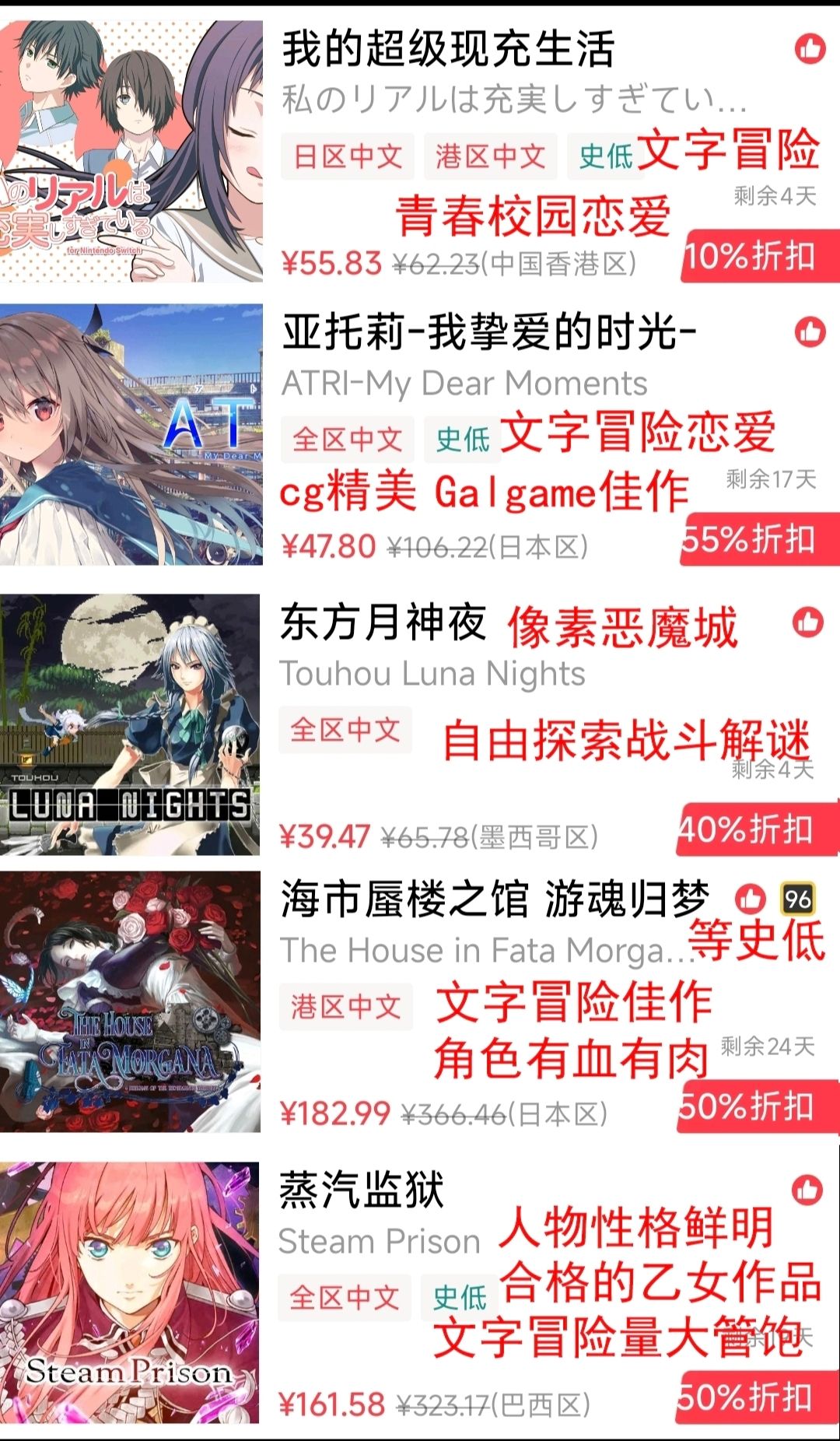 近期搜罗了40款史低游戏,总结的文字冒险比较多,可等史低入手 以上都是我个人推荐
