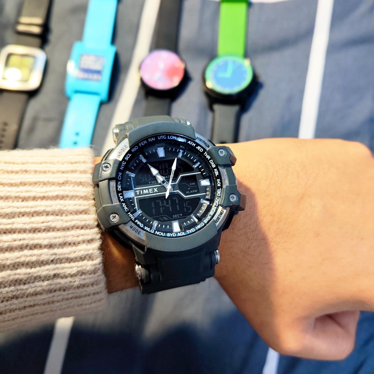 天美时tw5m231,淘宝售卖大概300。指针不走了,换的话麻烦,容易整坏。当个收藏算了。手表重快半斤了,带手上跟铐子似的,风格过于粗犷了。成色还不错,当个装饰还行。天美时爱好者,整好几块了,类似gshock风格,但是加了很多金属装饰。