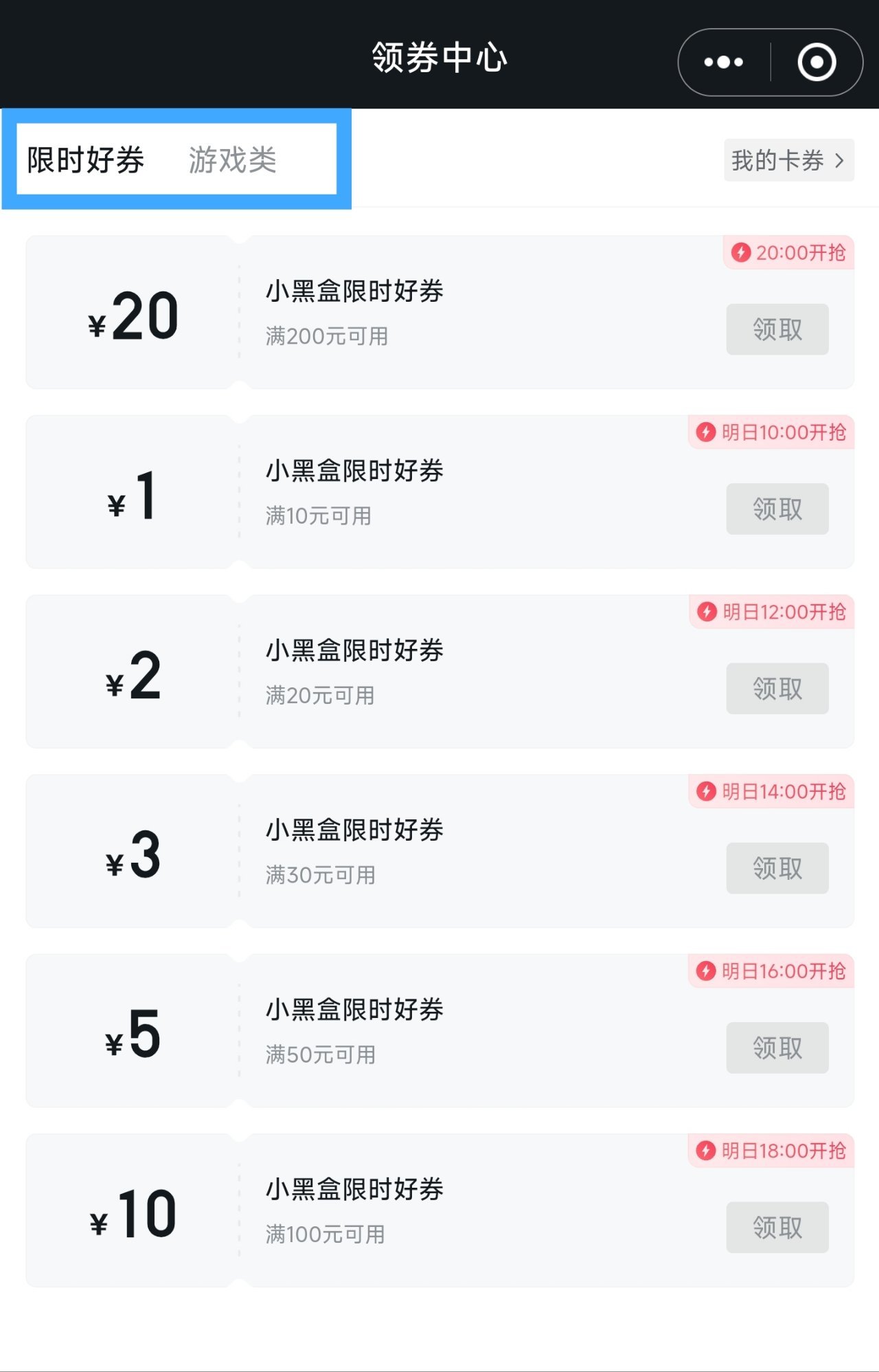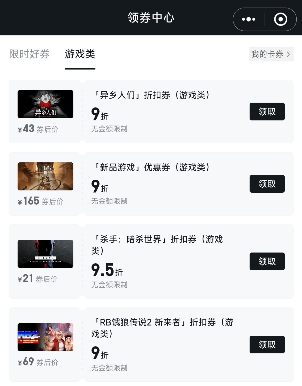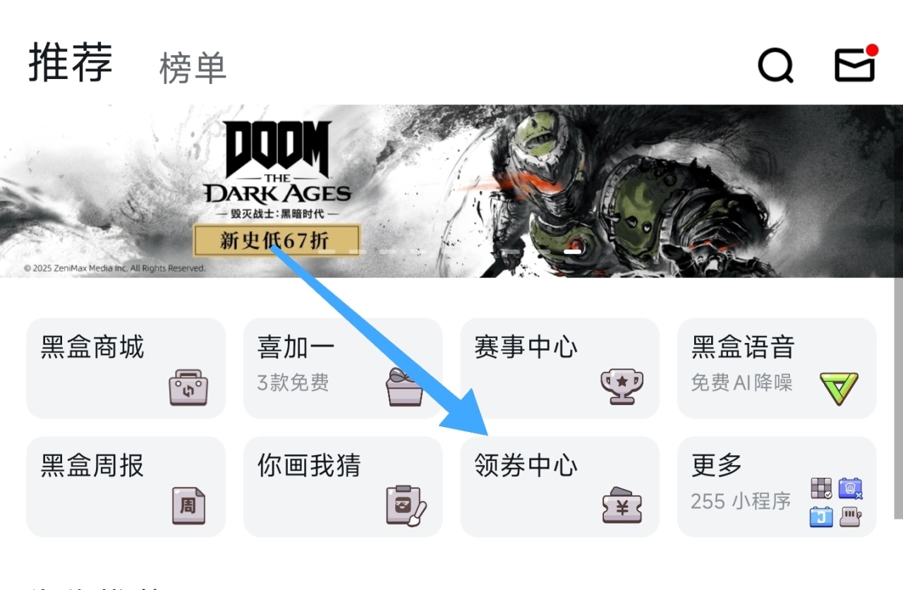 a.在游戏库的上方小程序栏“领劵中心”中可以定点抢优惠券或者领取特定游戏的折扣券。