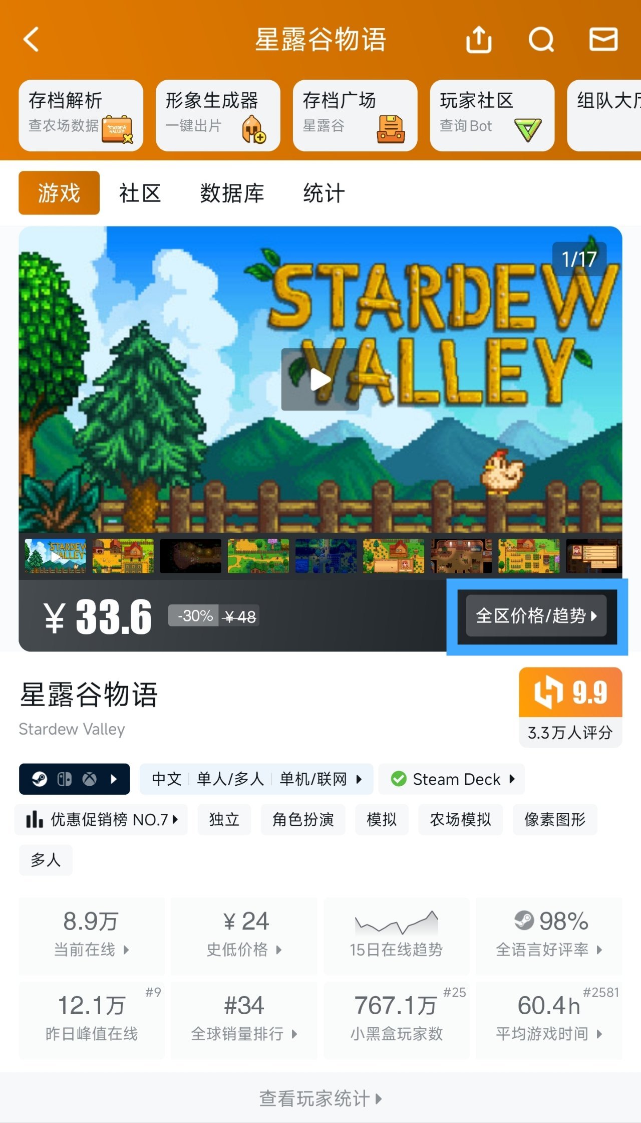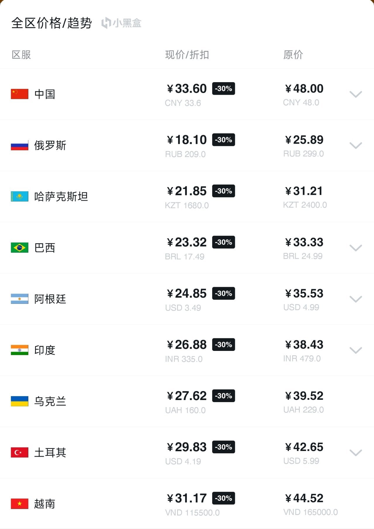 在任意游戏中价格右边部分就有“全区价格/趋势”,这里就可以查看当前游戏的其他地区当前的售价,单位统一是元,非常方便有多个Steam账号的玩家直接查询价格。