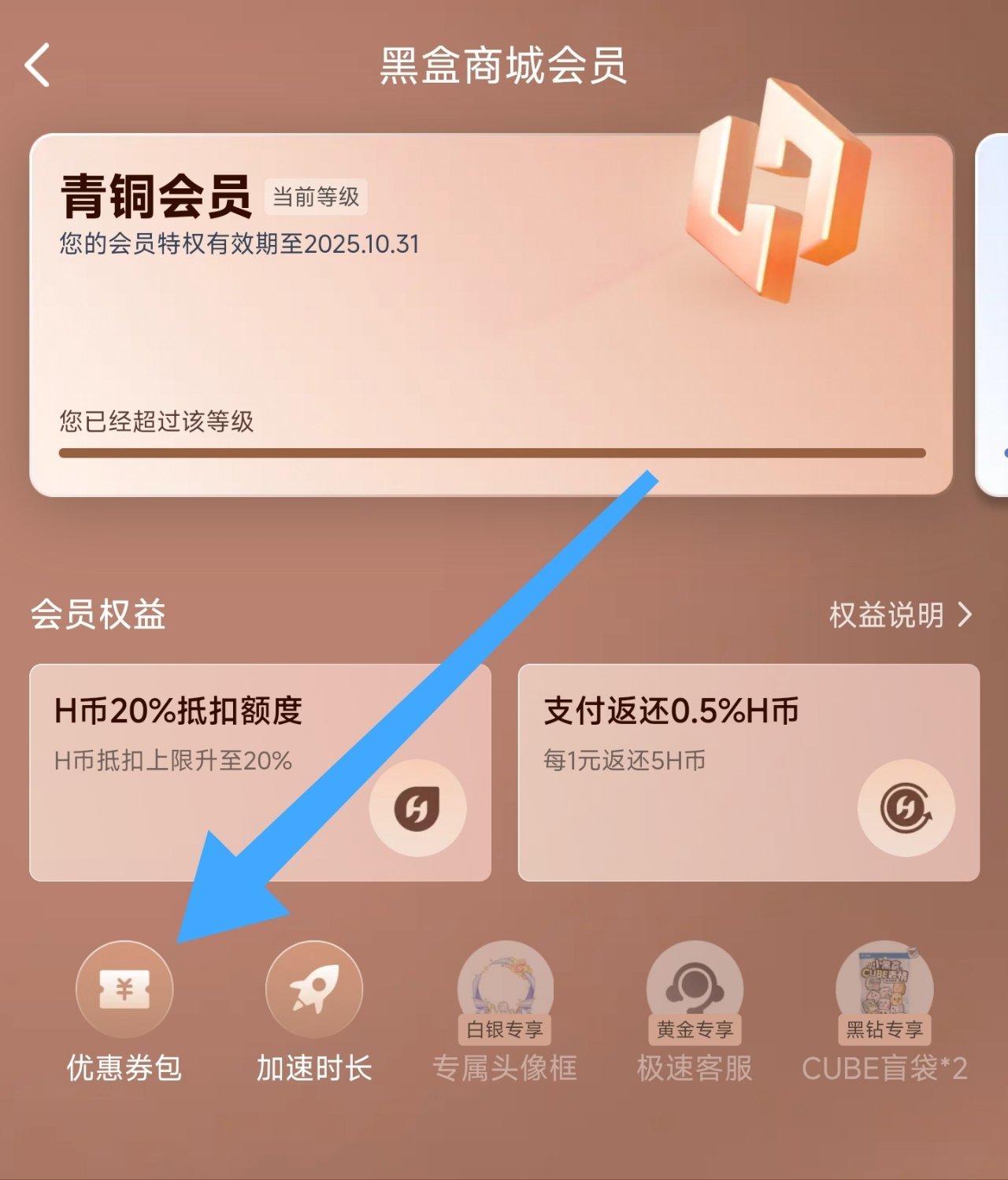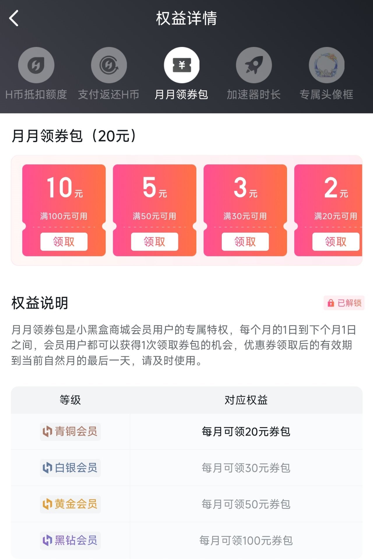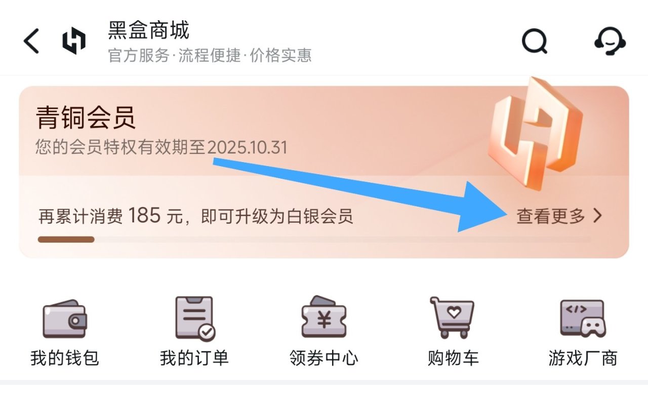 c.会员有每月优惠券,在游戏库小程序栏“黑盒商城”中点击会员的查看更多,再点击优惠券包领取对应的即可。