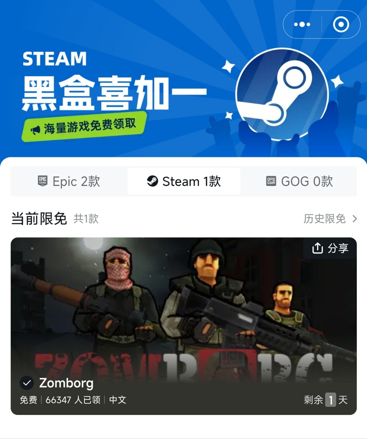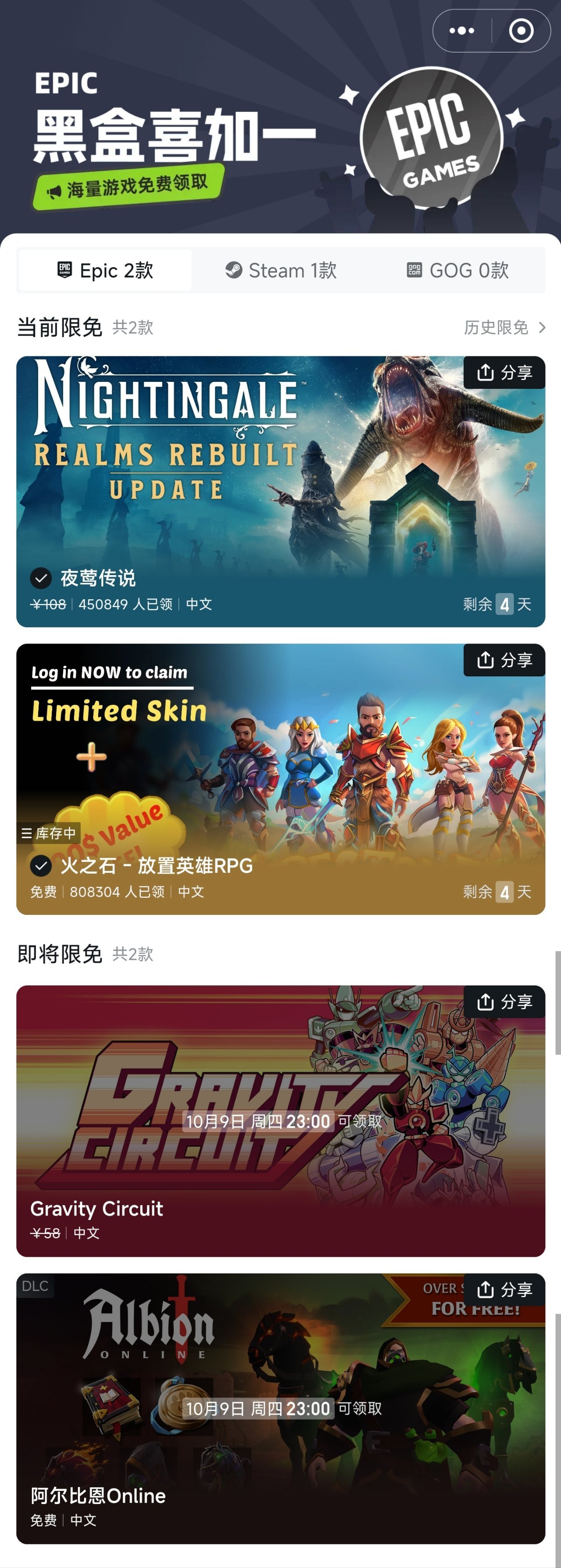 在游戏库上方有小黑盒官方的“喜加一”小程序内包含了主流的Steam、Epic和GOG三个平台的限时免费游戏,可以一键领取,非常方便,有时也有一些特别好评游戏限免,比如无主之地2和蒸汽世界:掘进。Epic还有未来限免预告。