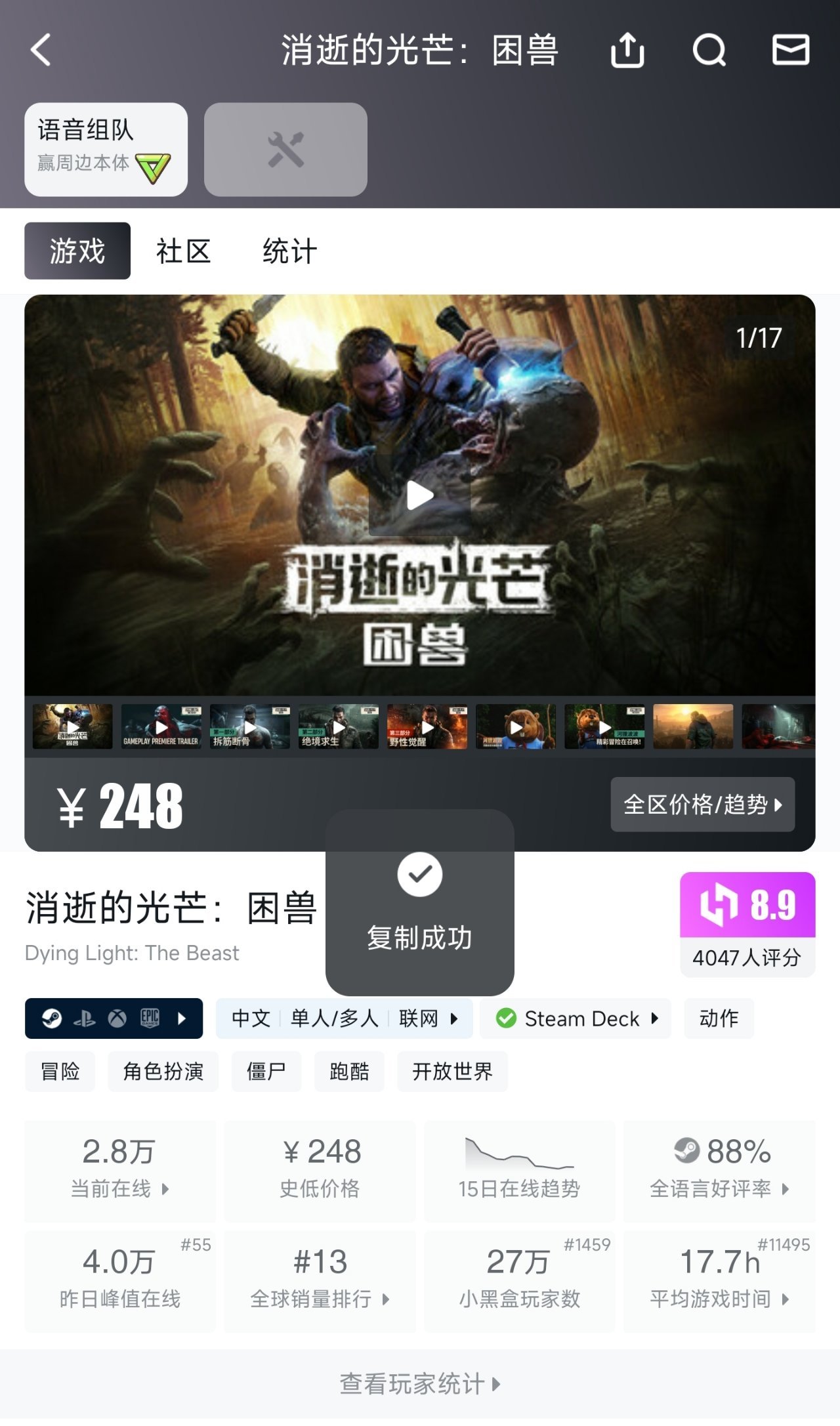 通常一个游戏拥有中外两个名称,搜索时一个一个输入十分不便,其实在小黑盒内任意游戏中点击中外语名称即可直接复制对应的名称。