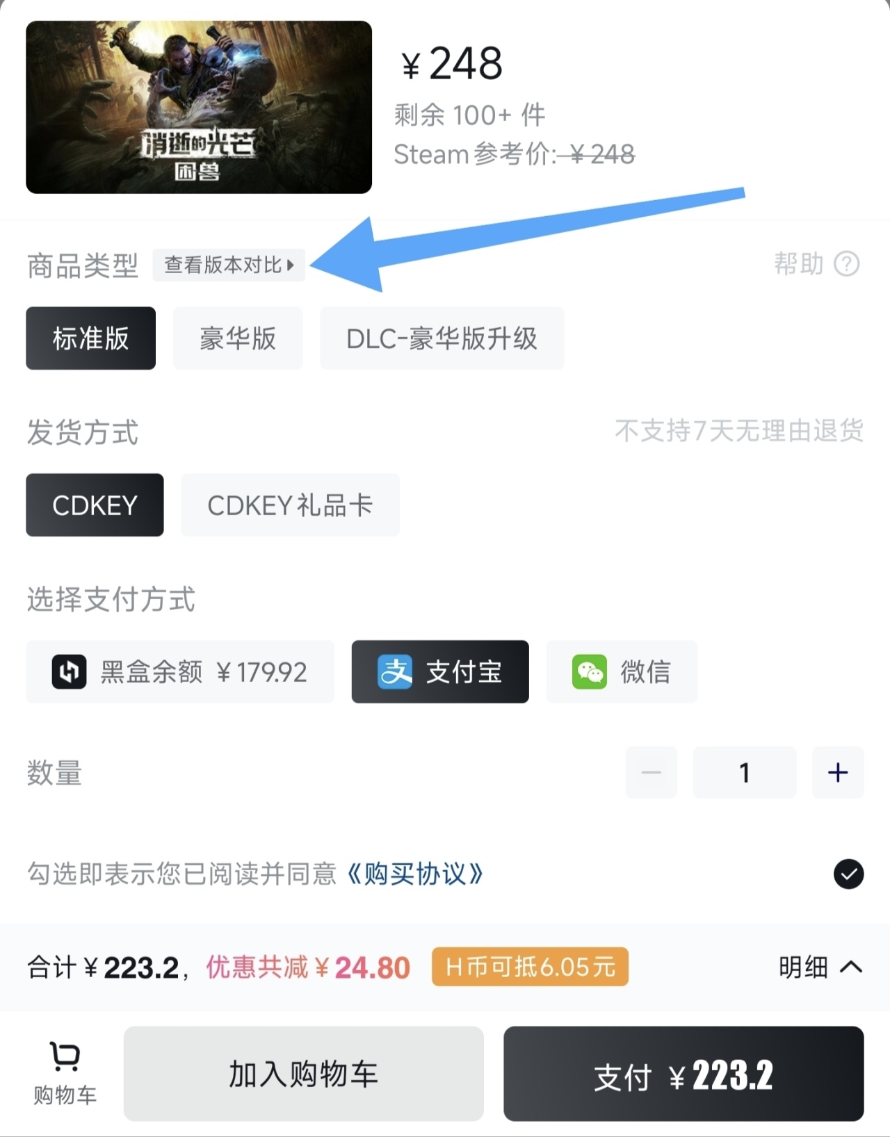 现在游戏有各种售卖版本:标准版、豪华版、终极版等等,在小黑盒就有其中各个版本包含哪些奖励,在任意有多版本的游戏中,点击购买在选择版本的上方有“查看版本对比”即可。