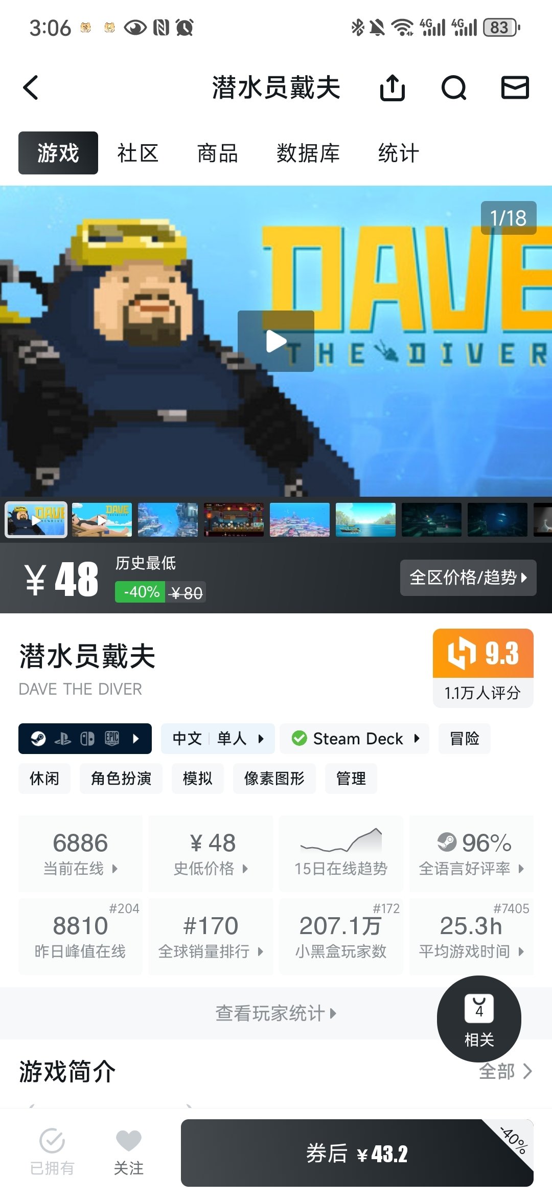 潜水员戴夫我真的超爱,每次捞鱼一捞就是两三个小时,除了鲛人族剧情有些让人烦躁以外,没有什么别的问题(但这个却是主线,还以为鲛人族结束后,还会有别的东西)两个免费的dlc,哥斯拉和变异鱼也好玩儿