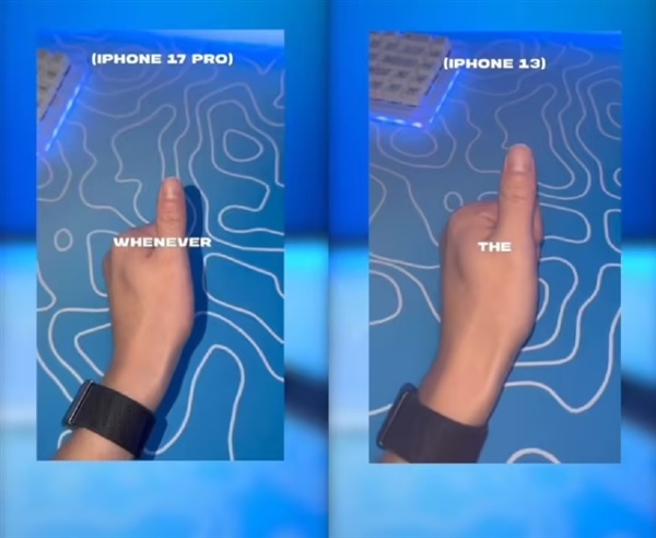该用户还对比了iPhone 17 Pro和iPhone 13,iPhone 17 Pro拍摄视频的手指旁边可以看到影子,而iPhone 13则没有。