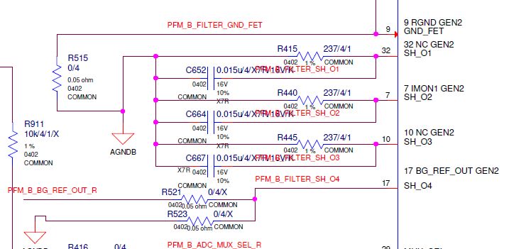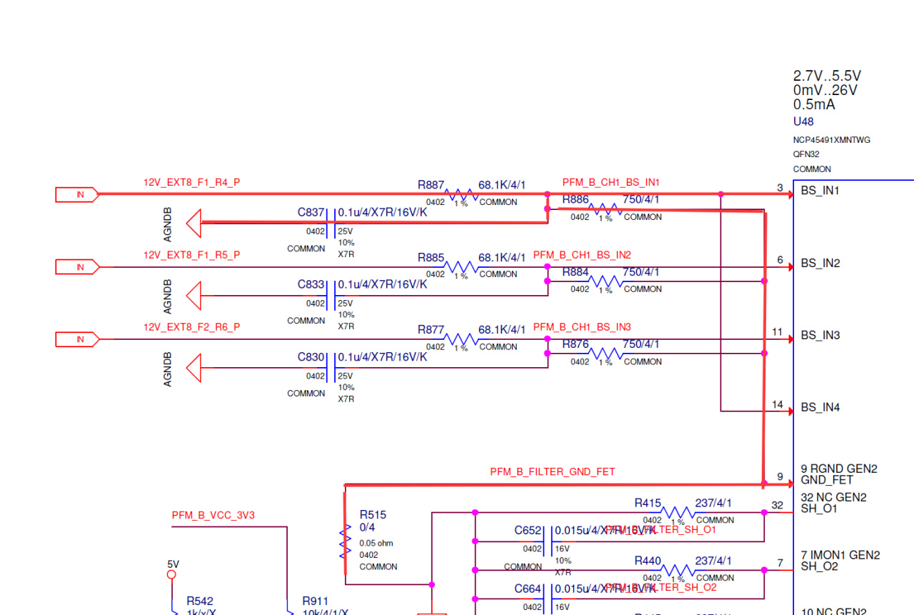 12V_EXT8_F1_R4_P這個電壓經過R887和R886串聯分壓輸入到BS_IN1,以GND_FET作爲0電位點,即可測的第一路電壓。如12V經過分壓之後得到0.13V