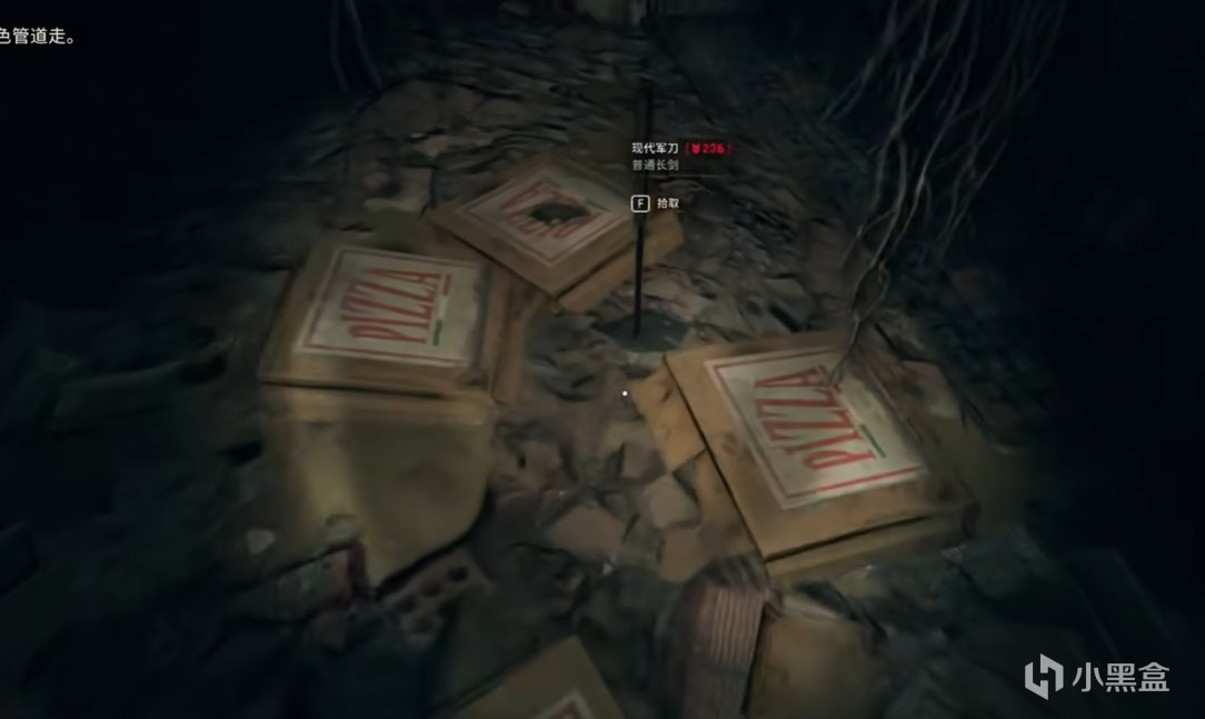 在支線《水泵謎題》裏的下水道的盡頭我們會發現四個披薩盒子和一把現代軍刀。