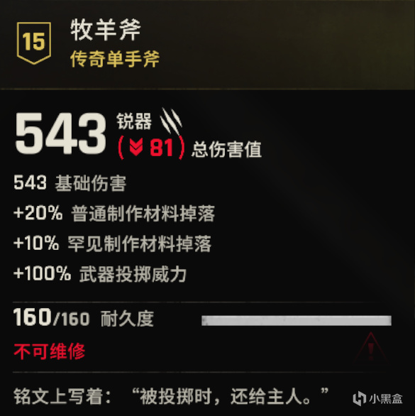在支線《堅守人性》最後的到的木屋頂樓的陽臺外,可以拿到一把名爲“牧羊斧”的傳說武器以及圖紙。