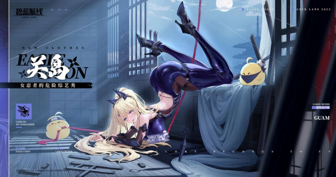 而關島的皮膚場景則處於適合潛入作戰的夜間,其整體服設也沿用了白鷹的風格,穿着緊身衣、戰術綁帶、監聽耳機等現代化裝備。所以,關島給人的感覺偏向於高科技忍者。