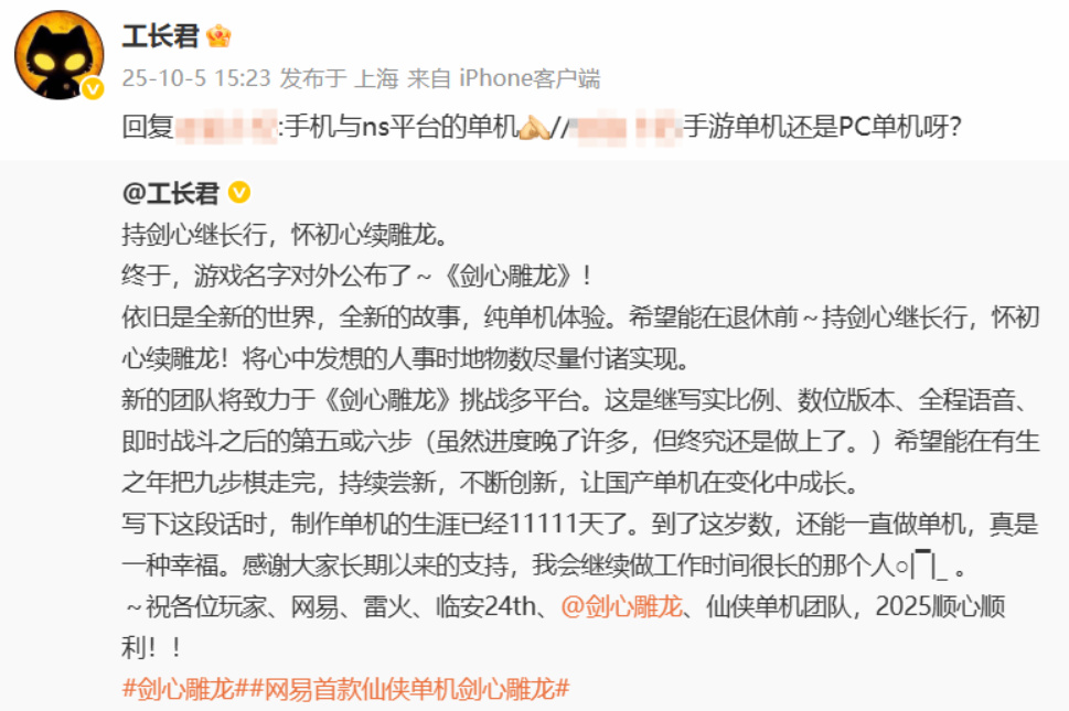10月5日,工长君在回应玩家提问时明确,游戏将登陆手机与NS平台,进一步扩大受众覆盖。此前谈及开发进展,他透露 “正在推进开发,整体品质也比年初时更好”,并分享创作心态:“不会跟风他人,更关注自身进步与团队初心,核心成员需真心热爱单机,不浪费彼此时间”。