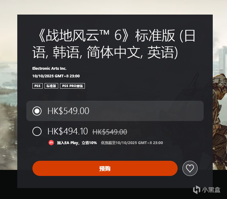 PS5 魅影版是 789 港币(约 722 元),包含游戏本体、战地风云 Pro 代币、魅影组合包和魅影经验值加成套。同样用 EA 会员的话,优惠后是 710 港币(约 649 元),截止时间也是 10 月 10 号晚 11 点。