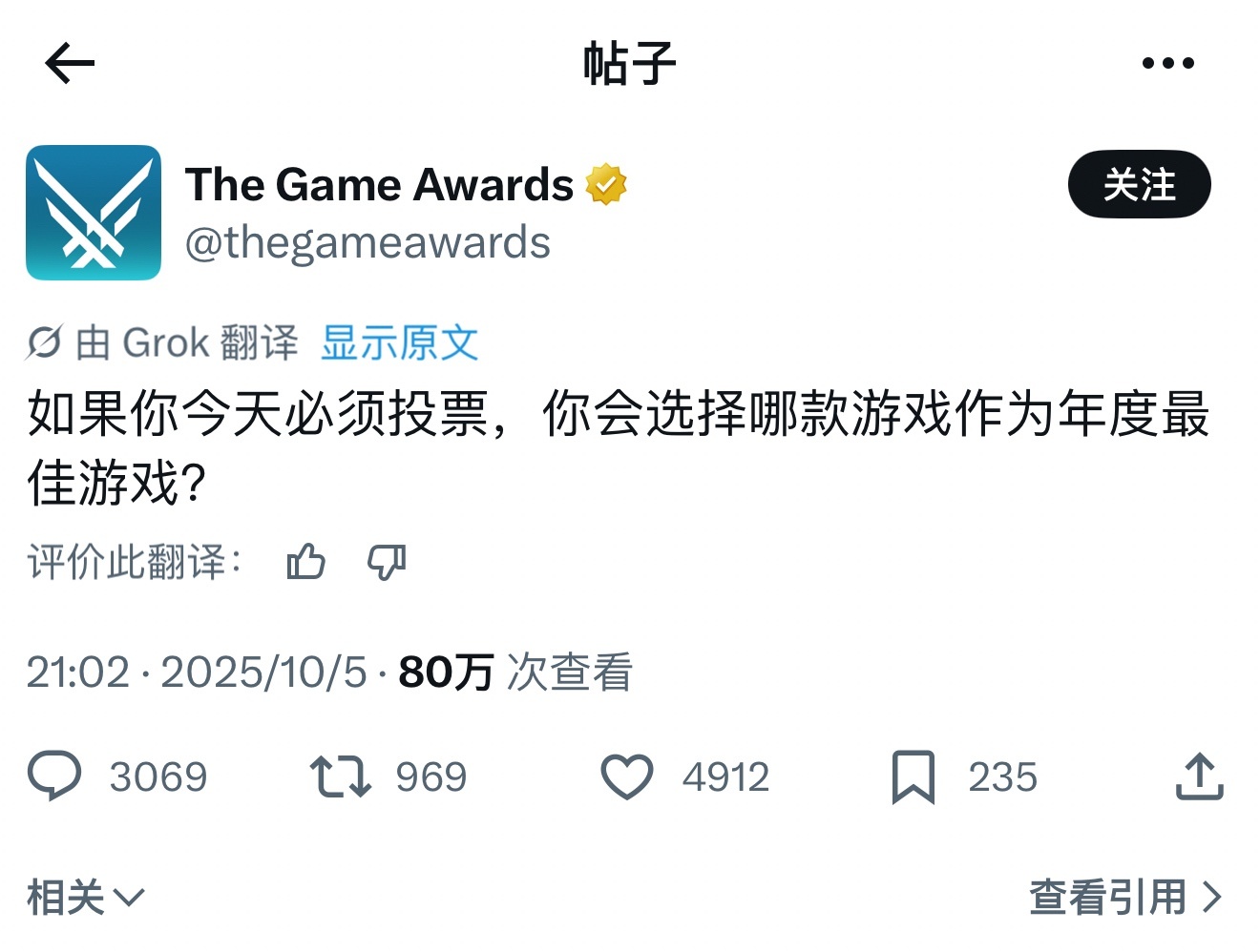 TGA(The Game Awards)官方 X(原推特)近日发起提问: