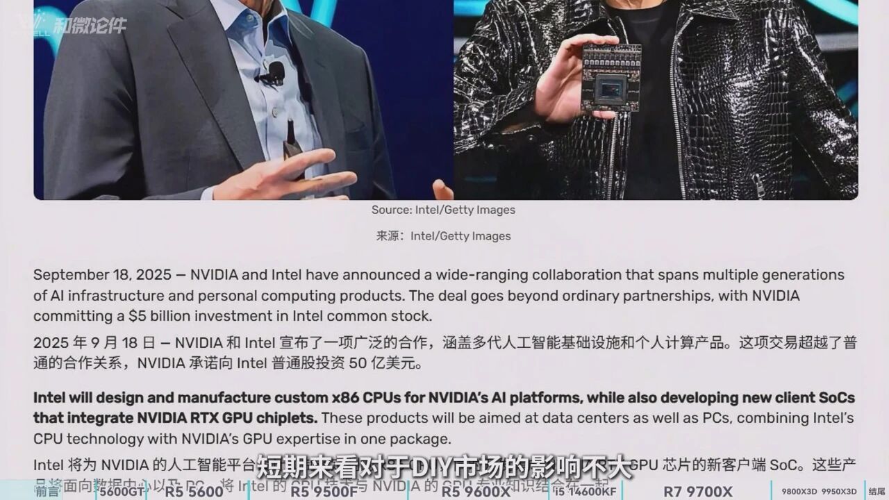 9月迎來了一塊新的CPU-9500F,它與9600X最大的區別在於去除了核顯,但這直接帶來了超過200元的價格優勢,目前散片閒魚約1100元出頭,對於追求極致性價比、搭配獨顯的遊戲玩家而言吸引力較大。更有消息稱,AMD後續還將推出無核顯的銳龍7 9700F,頻率與帶核顯的9700X保持一致,達到5.5GHz,值得期待。與此同時,行業格局也迎來鉅變,英偉達高調宣佈向英特爾投資高達355億人民幣,這筆史詩級的合作雖短期內對DIY市場影響有限,但卻爲未來埋下了無限遐想:我們是否會因此用上性能更強的Intel顯卡,抑或是迎來NVIDIA自主研發的CPU?整個行業的未來走向,瞬間充滿了新的看點。
