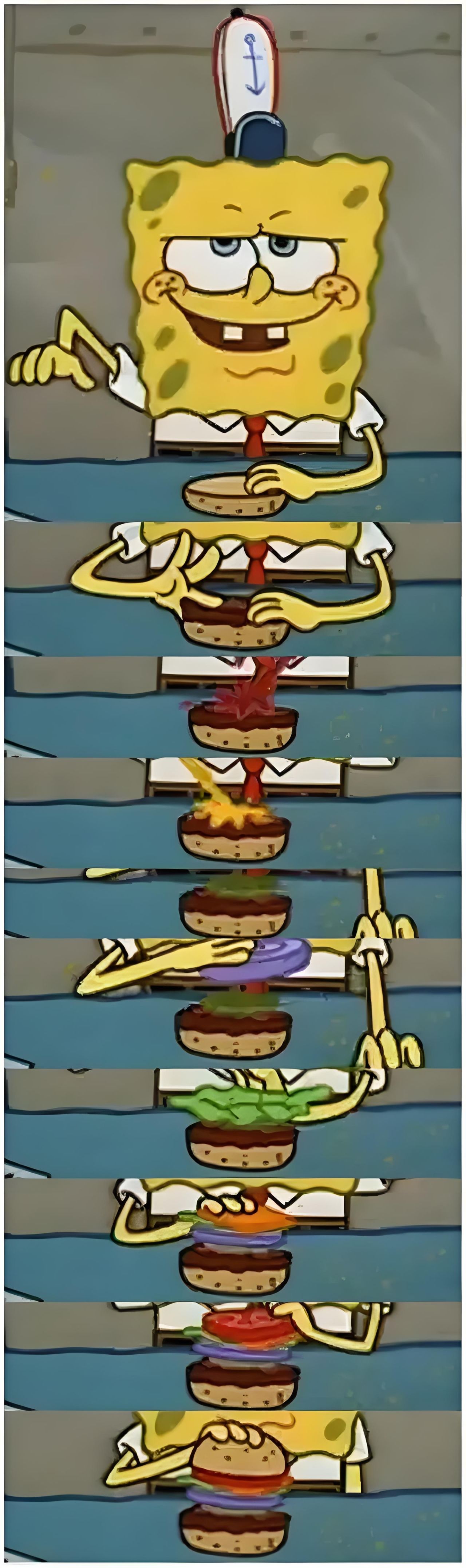 第二步:分別麪包、肉餅、生菜、奶酪、洋蔥、西紅柿、番茄醬、黃色芥末醬、醃椰菜,最後再加上面包,按次序排好。最後的最後再加上海綿寶寶滿滿的愛~