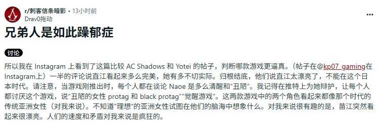 这种转变可能与《羊蹄山之魂》发售后玩家有了更直接的对比体验有关,促使他们重新审视《刺客信条:影》的角色设计价值。