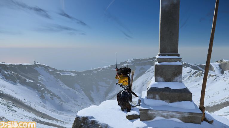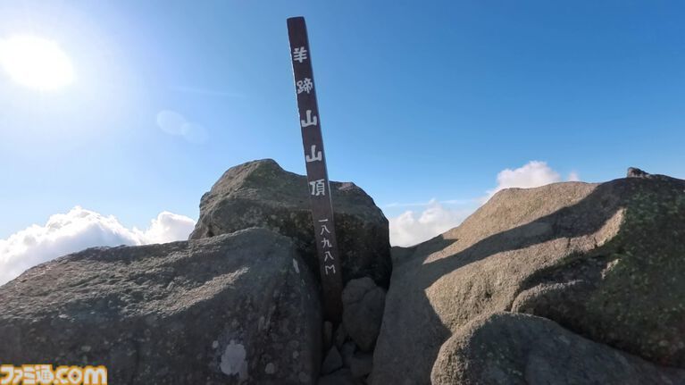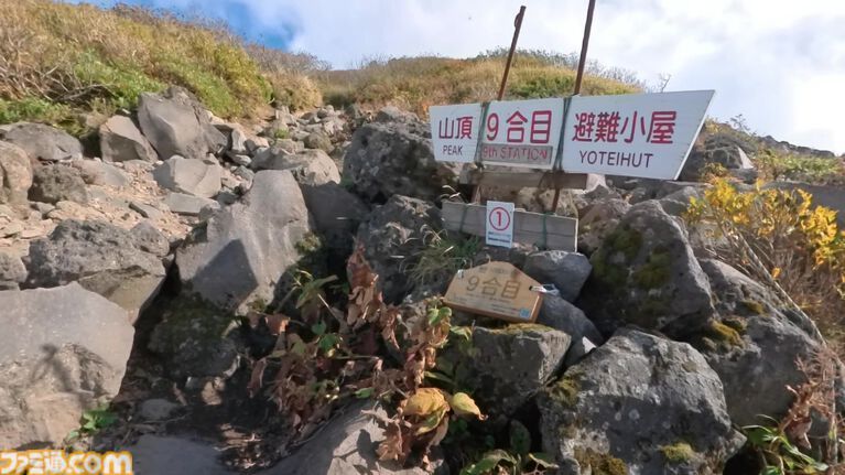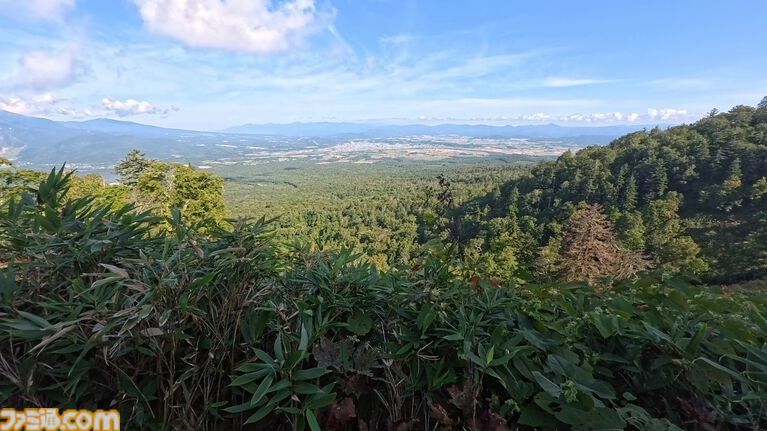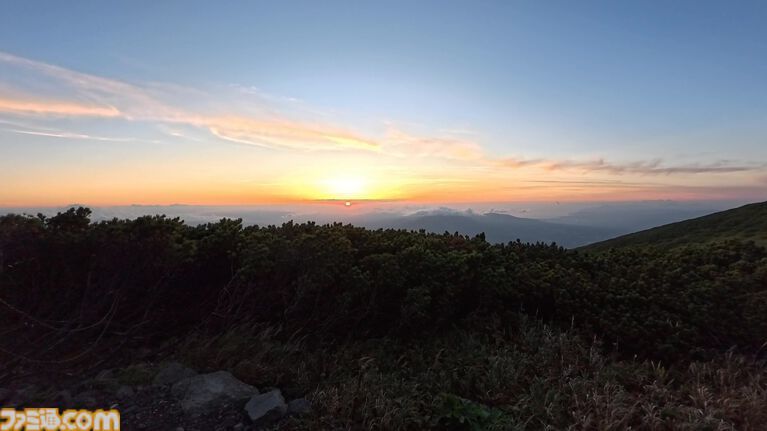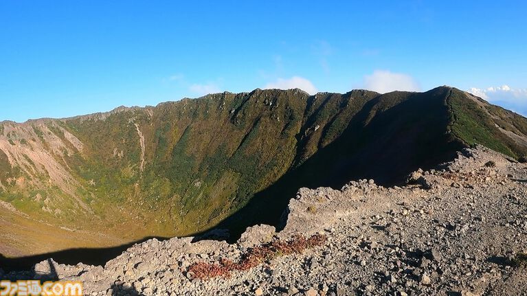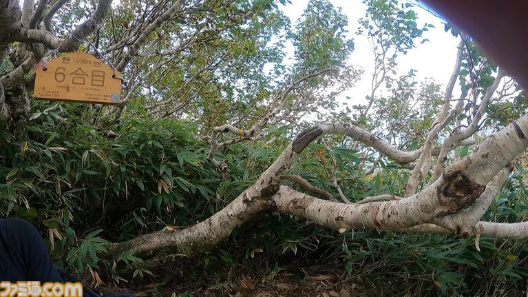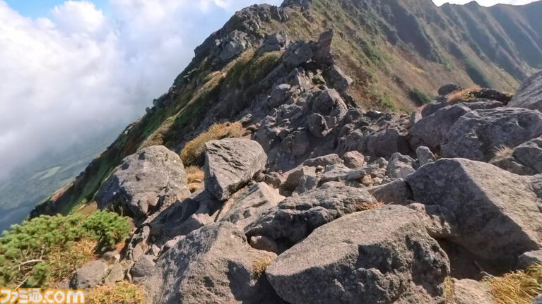 拄着登山杖設法攀登的過程中,偶爾也會到達視野開闊的地方。對於一直因爲路面狹窄、岩石又多而小心翼翼地低頭只看棕色地面的筆者來說,能突然看到這樣的景色真是令人欣喜。 此外,沿着山坡有風吹過,也稍微體驗到了些許彷彿被遊戲中"導風"引導的氛圍。當然,因爲會滑倒,並不能真的順着風向走。
