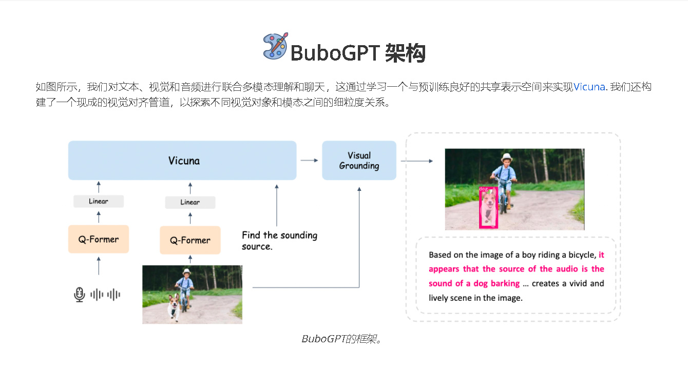 BuboGPT是由字节跳动开发的大型语言模型,能够处理多模态输入,包括文本、图像和音频,并具有将其响应与视觉对象相对应的独特能力。