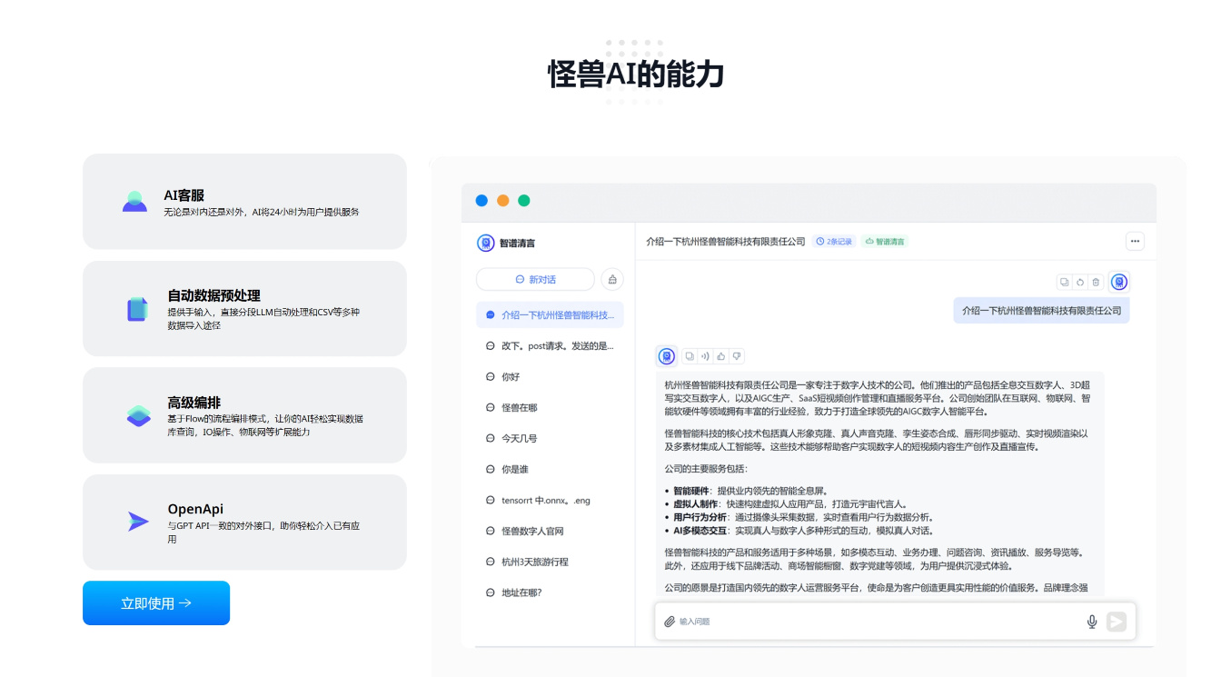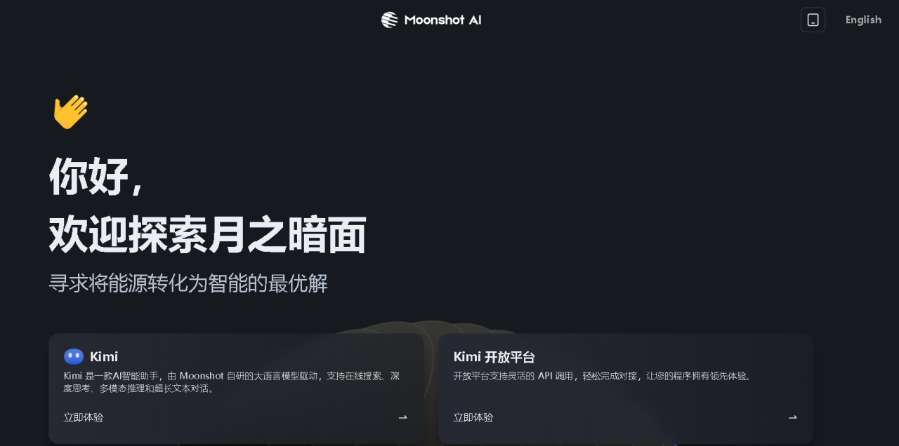中文名:月之暗面,一家专注于大模型技术的创业公司,月之暗面致力于将能源转化为智能,通过产品与用户共创智能,实现普惠AI。