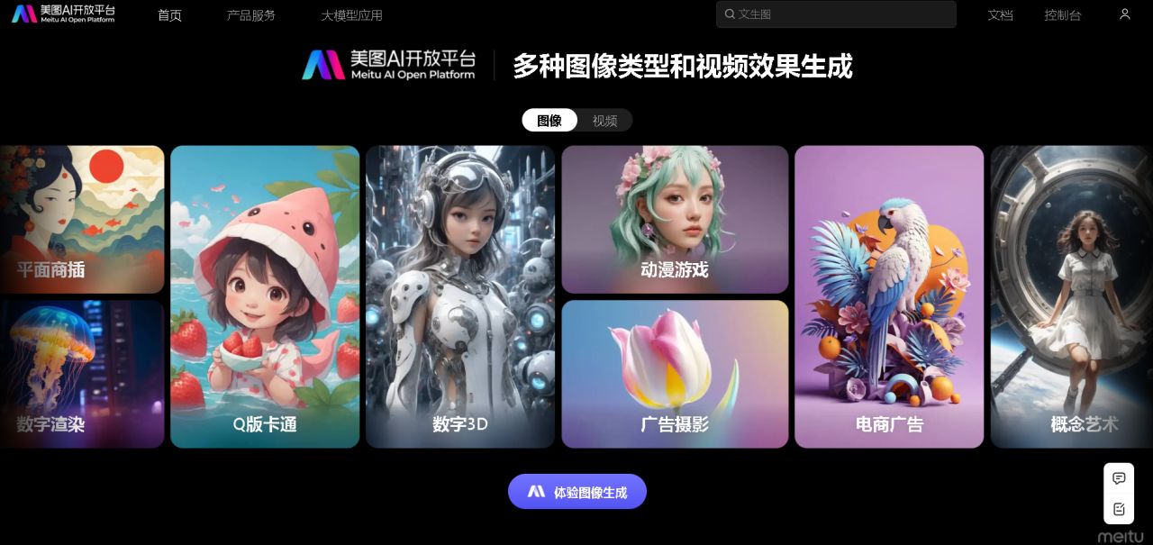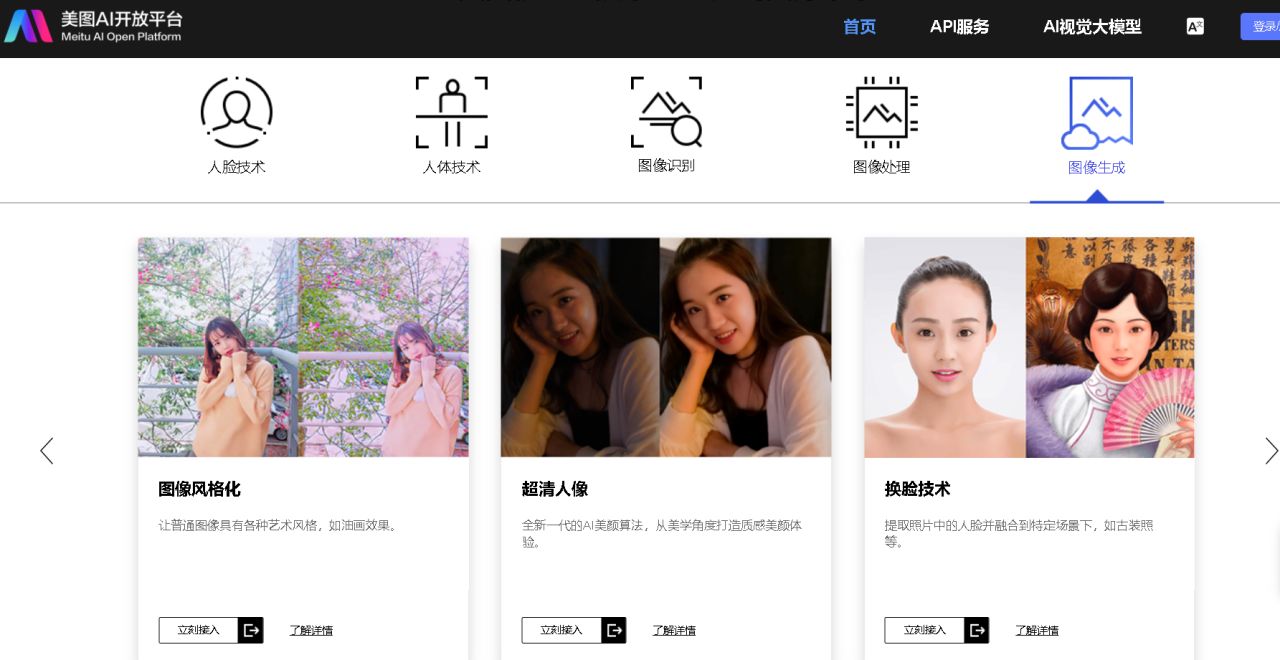 美图公司推出的AI服务平台,专注于人脸技术、人体技术、图像识别、图像处理、图像生成等核心领域,为客户提供经市场验证的专业AI算法服务和解决方案。