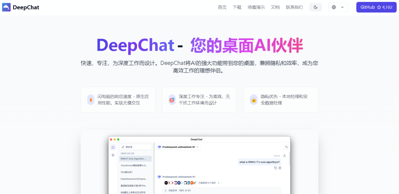 一款开源的AI聊天客户端,内置强大的 DeepSeek 大模型,支持多轮对话、联网搜索、文件上传、知识库等多种功能。
