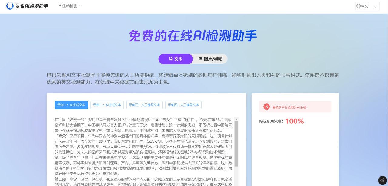 腾讯推出的一款专门用于识别AI生成内容的工具,主要应用于对生成的文本和图像的检测。