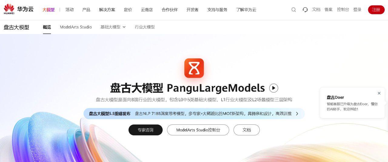 华为云推出的一项人工智能技术,包含了多个领域的大型模型,包括自然语言处理(NLP)大模型、计算机视觉(CV)大模型、多模态大模型、预测大模型和科学计算大模型。