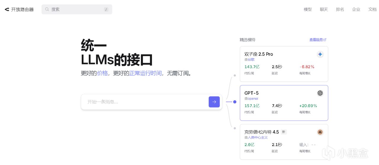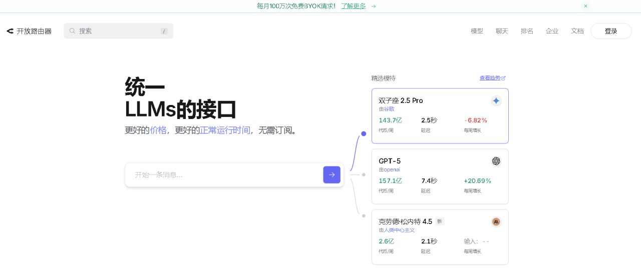 一个整合多个AI模型的平台,提供统一的API接口,方便开发者调用不同公司的大模型,目前支持 60 多家提供商和 500 多个模型,比如 GPT、Claude、LLaMA 等。
