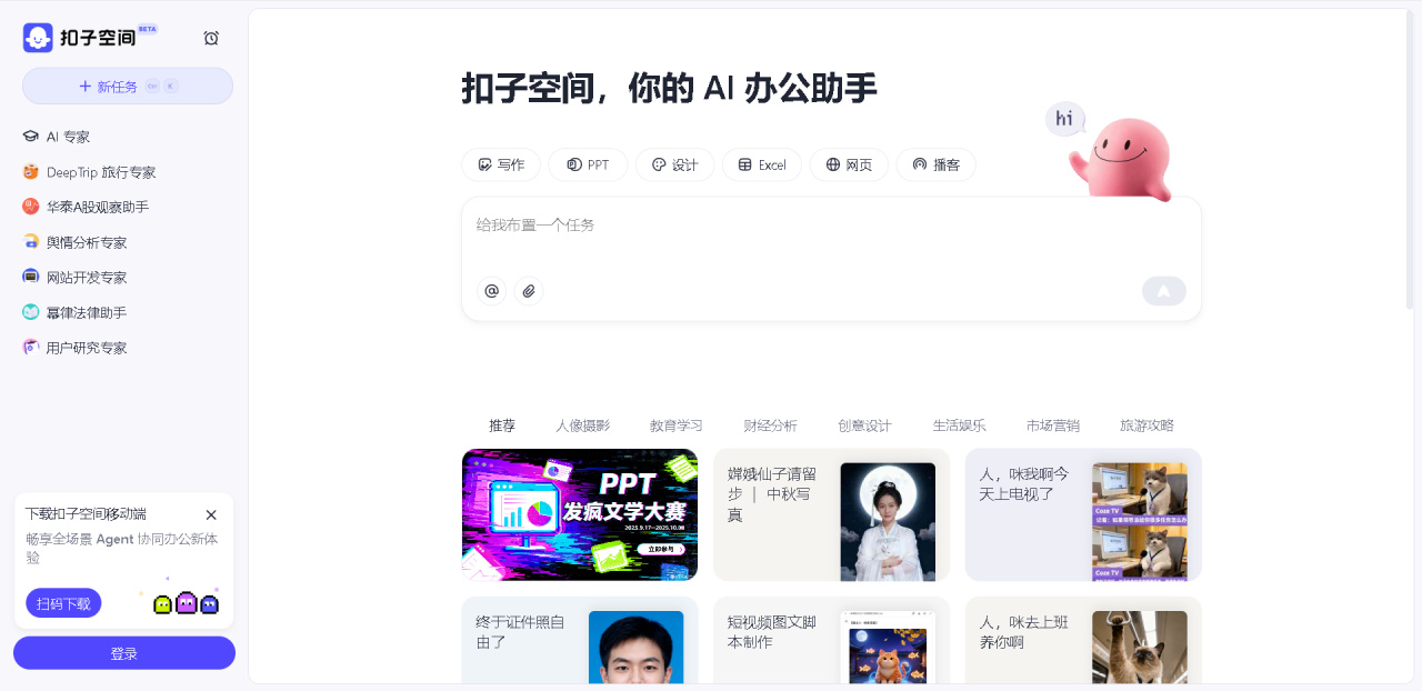 字节跳动推出的一个主打“一句话完成任务”的自动化AI平台。只需提交任务,扣子空间即可自动完成任务并返回结果。
