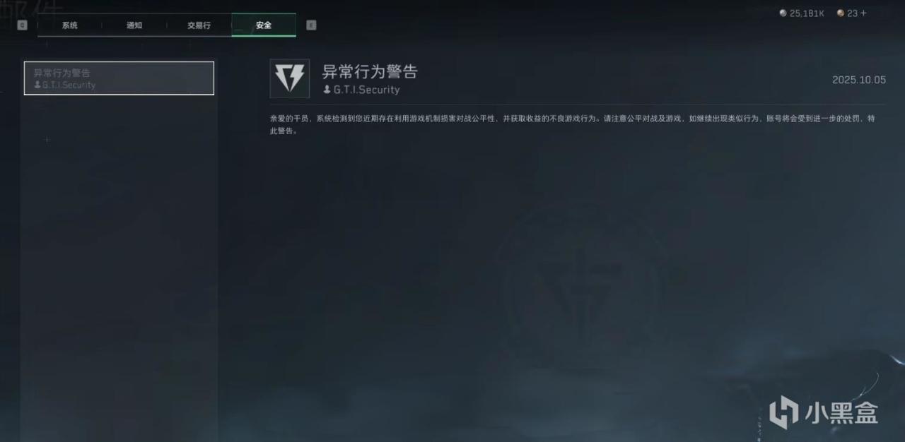 亲爱的干员,系统检测到您近期存在利用游戏机制损害对战公平性,并获取收益的不良游戏行为。请注意公平对战及游戏,如继续出现类似行为,账号将会受到进一步的处罚,特此警告。