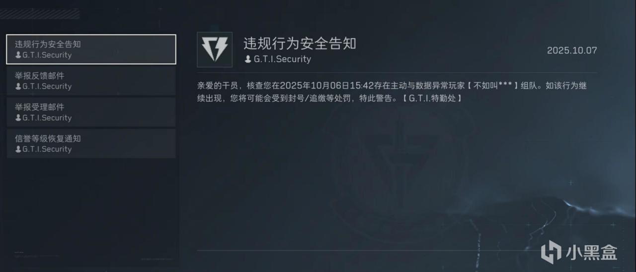 亲爱的干员,核查您在 2025 年 10 月 06 日 15:42 存在主动与数据异常玩家【不如叫***】组队。如该行为继续出现,您将可能会受到封号/追缴等处罚,特此警告。【G.T.1.特勤处】