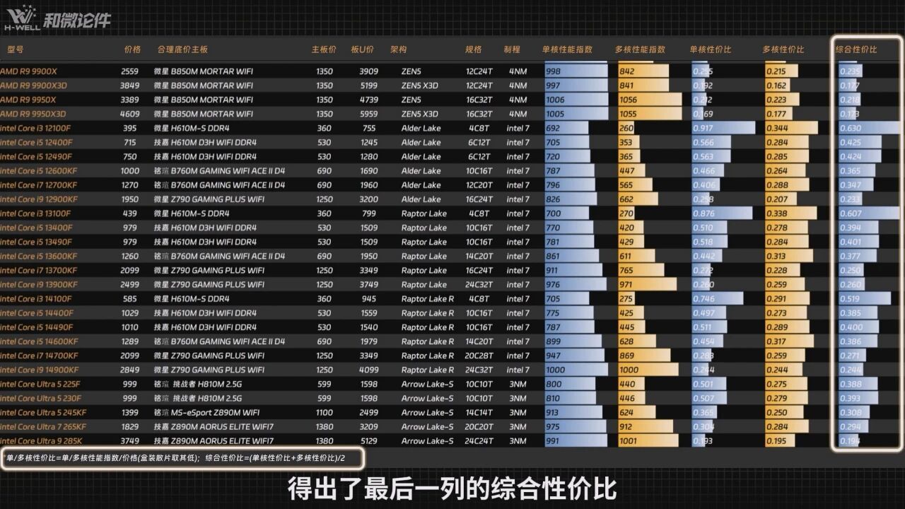 如果你是游戏玩家,只要CPU没有出现在这个图中,那就不推荐购买,就算在这个图中,也不是全都值得购买,我们利用图表下方的算法,得出了最后一列的综合性价比,然后将综合性价比进行排序,得到了这种综合性价比倒置天梯图,从上到下,再一一进行核验,看看到底哪些U不值得碰。