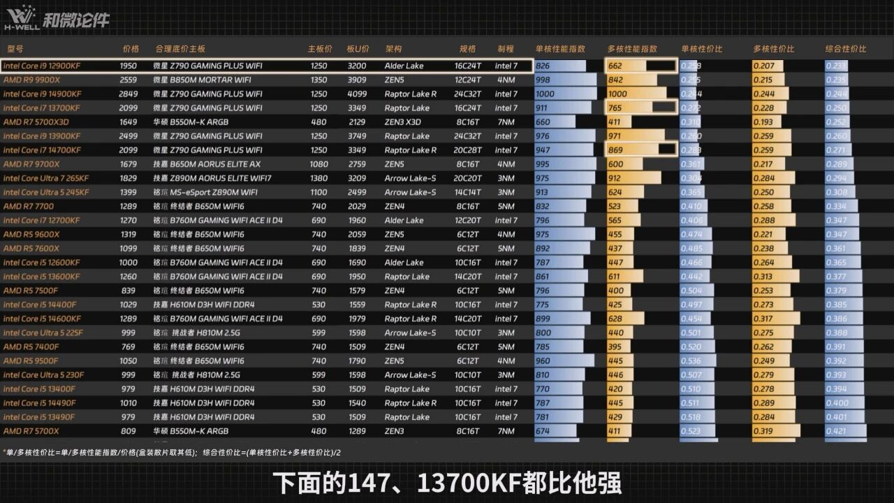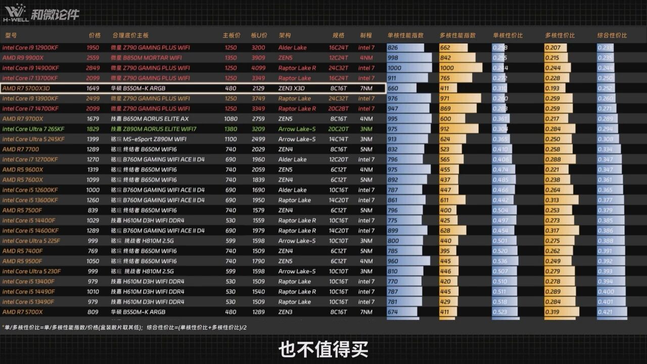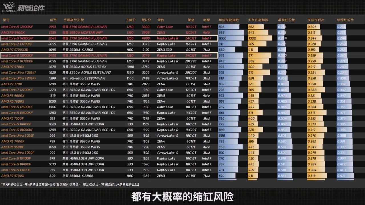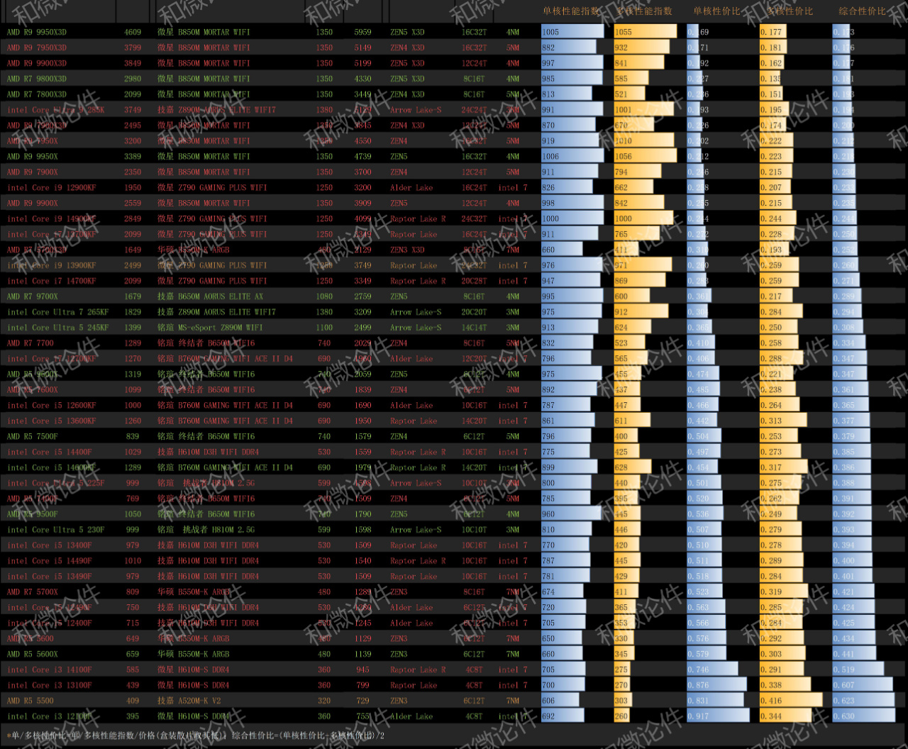 如果你是遊戲玩家,只要CPU沒有出現在這個圖中,那就不推薦購買,就算在這個圖中,也不是全都值得購買,我們利用圖表下方的算法,得出了最後一列的綜合性價比,然後將綜合性價比進行排序,得到了這種綜合性價比倒置天梯圖,從上到下,再一一進行覈驗,看看到底哪些U不值得碰。