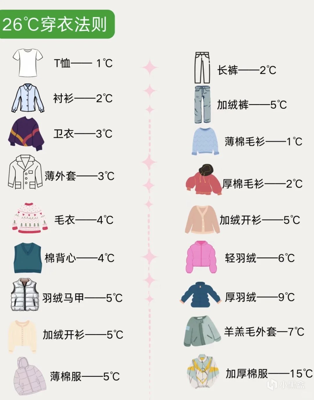 较厚的羽绒服相当于9℃,薄款羽绒服6℃,稍厚的弹力絮棉衣5℃,厚羊毛衫是4℃棉背心4℃ 抓绒衣服,薄外套是3℃ 后的棉衣衫是2℃ 薄的棉毛衫是1℃,穿衣公式:环境温度+衣物对应温度=26,例如:环境22℃,穿一件短袖加一件薄外套:22+1+3=26。
