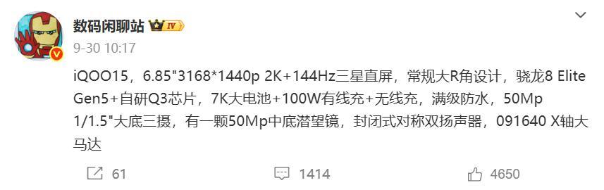 搭載驍龍8 Elite Gen 5處理器和電競獨顯芯片Q3,內置7000mAh電池,支持100w有線充電+50w無線充電,補齊了很多短板,也有金屬中框、IP68/IP69頂級防水。