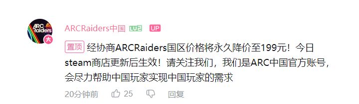 ARC Raiders宣布,经过协商后决定将10月30日发售的《穹顶突击队》国区价格进行调整,标准版原价¥289计划降至¥199,豪华版降幅暂未公布。