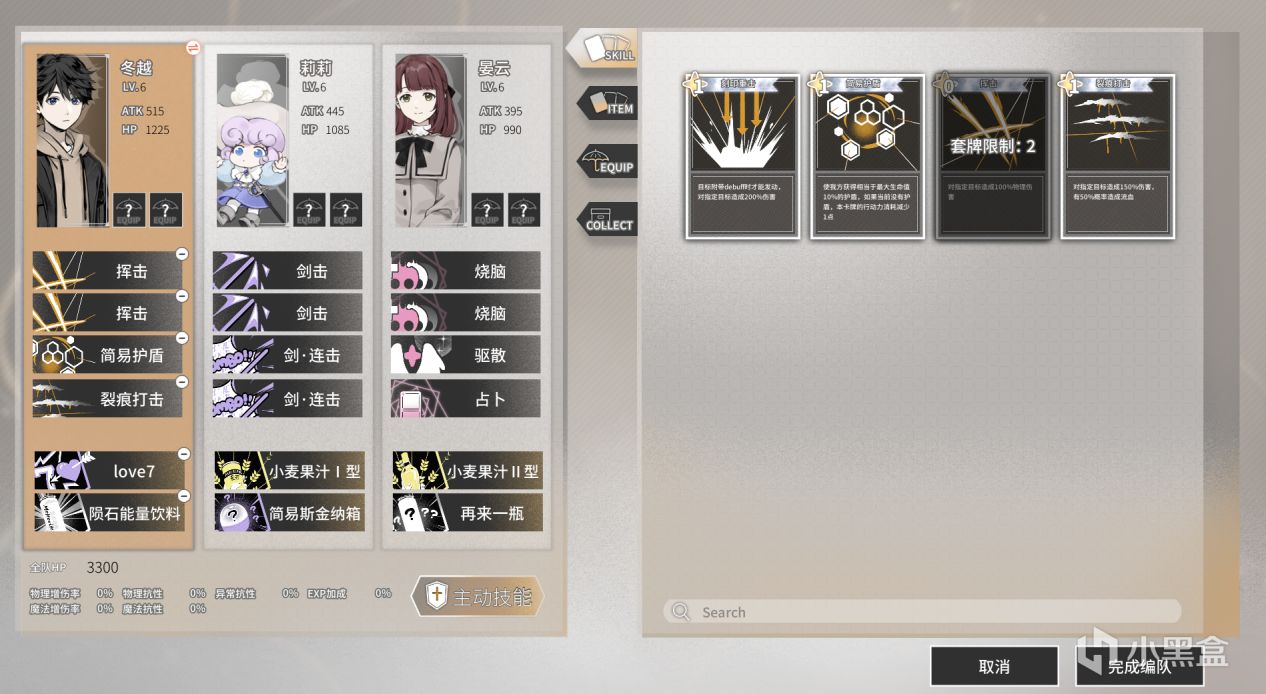 在这部分的要素中,我们可以通过在八位可操纵角色中选择三位进行配队,以此来构筑自己的牌组和更改牌库