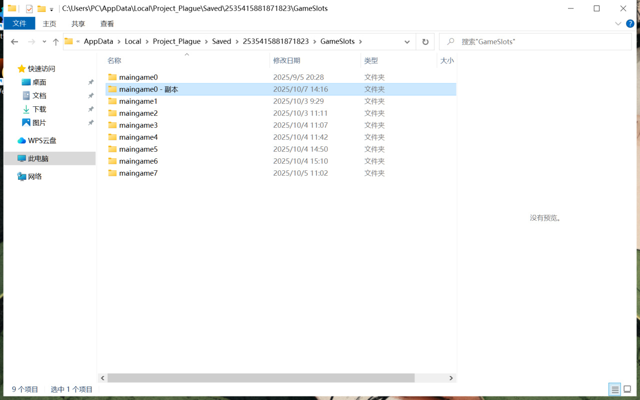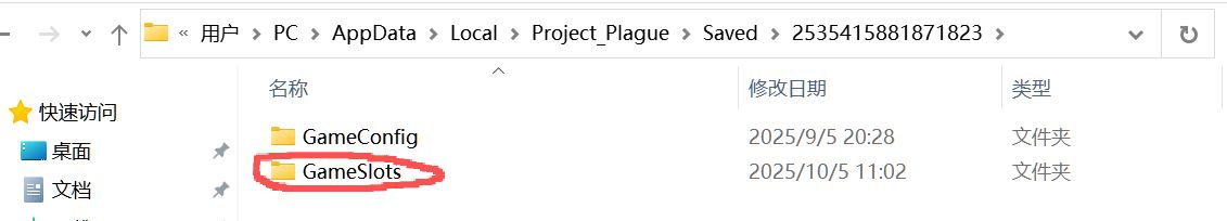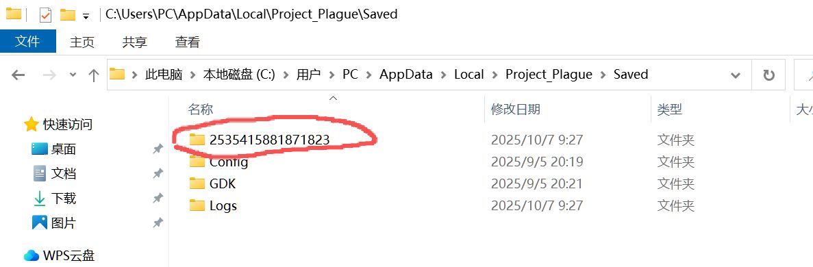 此电脑➡c盘➡用户(你的用户名,每个人可能不一样)➡PC➡AppData➡Local➡Project_Plague➡Saved➡一串数字