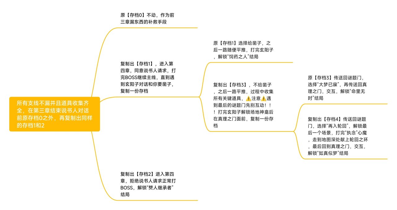 所以我个人建议的方式是一周目自己瞎玩,把内容体验个七七八八,二周目再结合攻略补全缺失内容,同时备份存档sl出另外三个结局,我认为这是一个体验比较好的节奏。