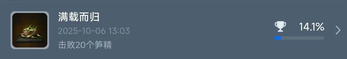 成就需要累积收集20个笋精掉落的竹笋,这个是多周目集成的,你一周目打15个,二周目打5个,只要在一个档里就能解锁成就。