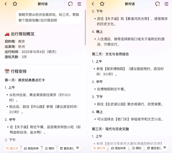 AI 的想象力在于,它能成为一个超级出行管家,你说句 “ 我周末,一家三口想去三亚玩三天 ”,他能直接给你出旅游攻略,还顺带打包给一个 “ 机票+酒店+当地用车 ” 的方案。