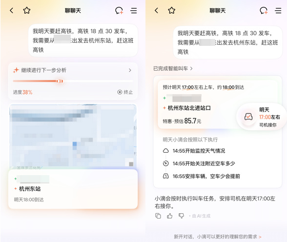 再比如 “ 我明天要赶 18 点 30 的高铁 ”,它能结合时间、天气和路况,帮你预估出发时间来约这个车。