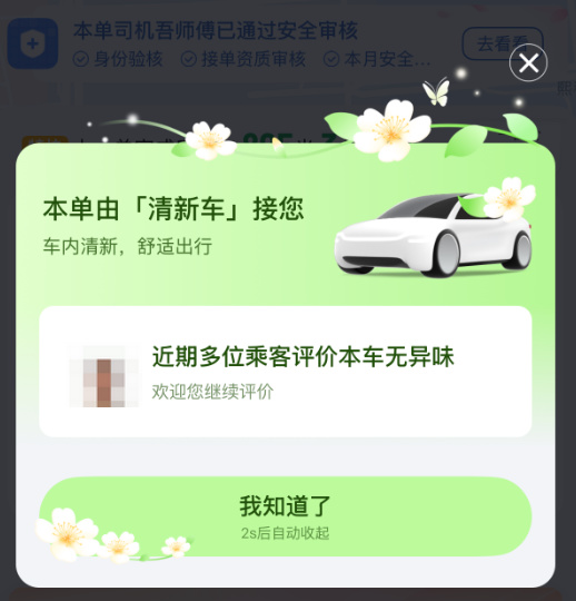 前几天,世超普通打车就打到了清新车,上车后还有略显尴尬的语音播报:本单乘客偏好无异味车,请司机打开窗户通风(大意哈)。