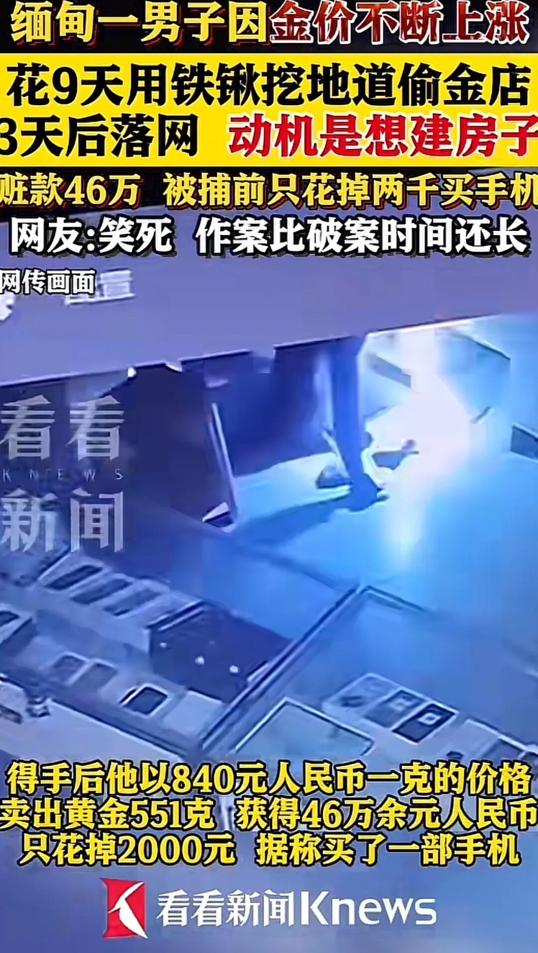 3天后,嫌犯落网,他称自己动机是想建房子,看到金价不断上涨起了贪念,该地洞耗时9天挖出,赃款46万只花了2000买手机。