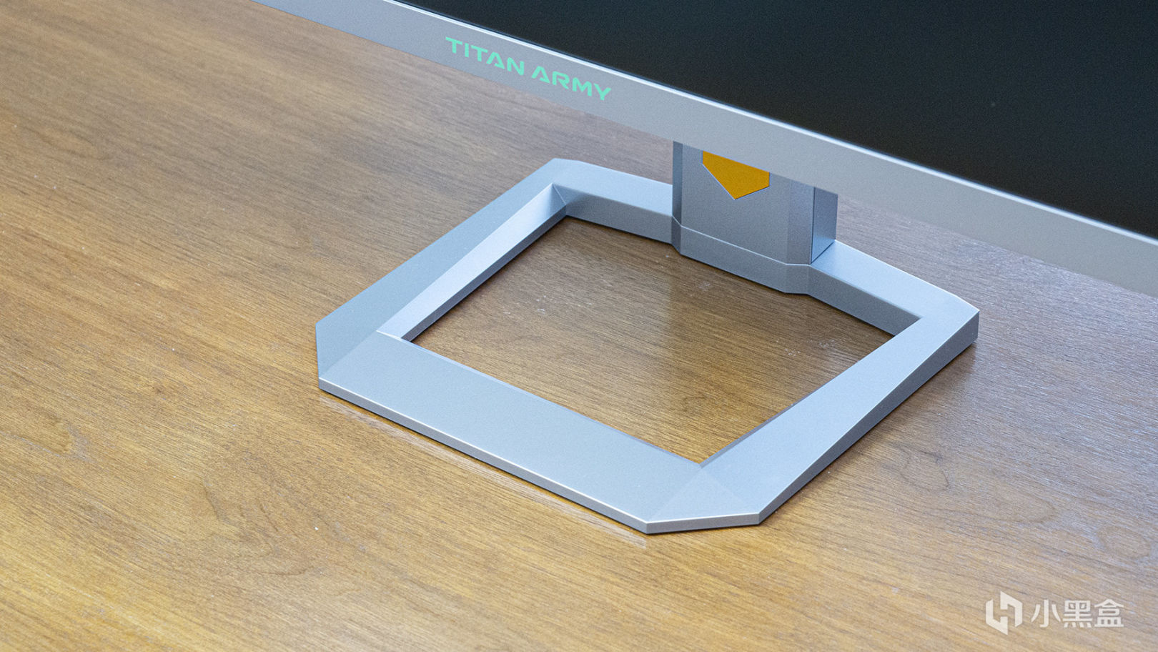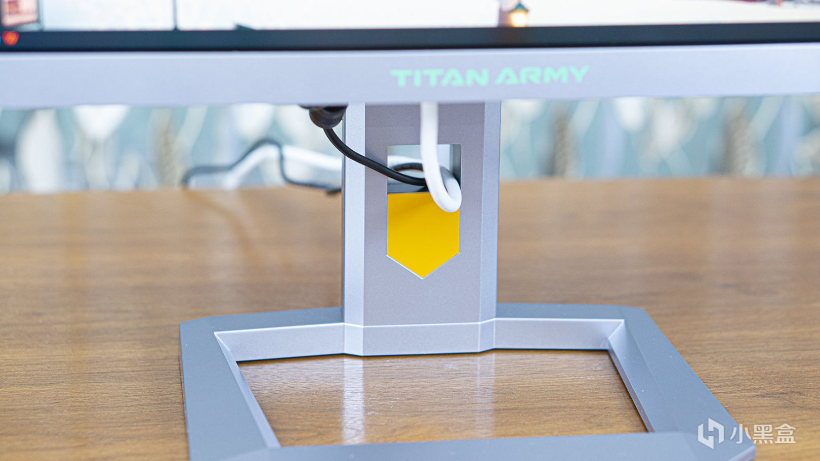 底座上亮黃色的標誌,使泰坦軍團P27A6V多了幾分靈動,它上面的穿線孔可以讓數據、電源線更規整地分佈,從而讓檯面看起來更爲整潔。