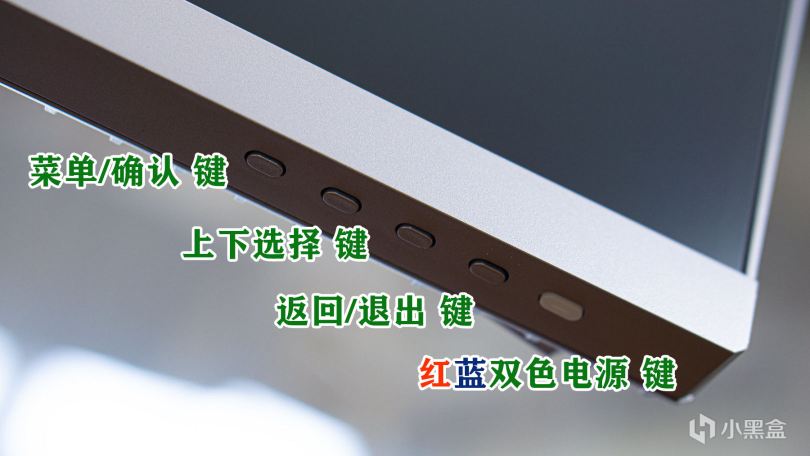 顯示器底部右側分別是菜單、兩個選擇鍵及附帶藍色(開機)、紅色(待機)燈光的電源鍵,